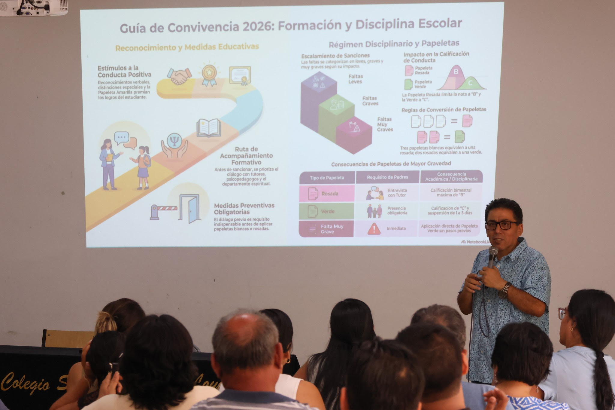 Nuestros docentes participaron en el taller “Conducta positiva y clima del aula”, un espacio de formación orientado a fortalecer ambientes de aprendizaje sanos, respetuosos y formativos. Durante la jornada se compartieron estrategias pedagógicas para reconocer y estimular conductas positivas, aplicar medidas formativas con coherencia y fortalecer la autoridad docente como modelo de convivencia, renovando así el compromiso de promover un clima de aula que favorezca el aprendizaje y la formación integral de nuestros estudiantes.