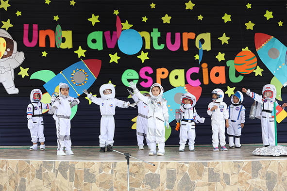 Las niñas y niños del Ciclo I sorprendieron a sus familias con la presentación del proyecto “Una aventura espacial”, una propuesta que les permitió explorar el universo a través de canticuentos, adivinanzas, bailes y relatos sobre el sol, la luna, las estrellas, las constelaciones y los viajes espaciales.